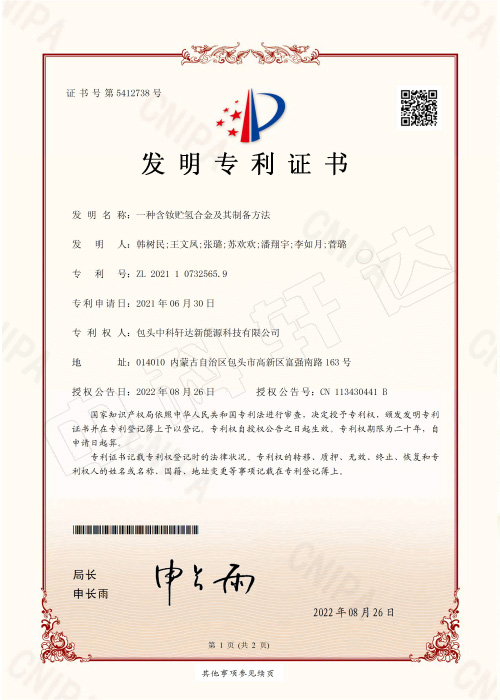 CN-21--0003-I-5257-一種含釹貯氫合金及其制備方法-發(fā)明專利證書(簽章)(1)-ZL 2021 1 0732565.9