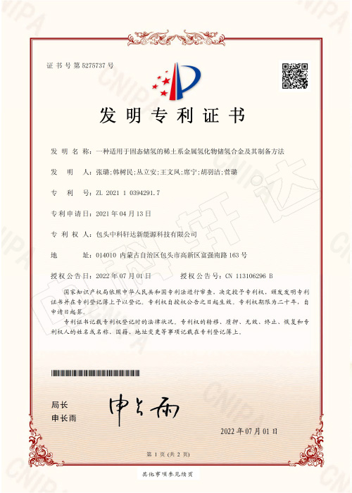 CN-21--0002-I-4074-一種適用于固態(tài)儲氫的稀土系金屬氫化物儲氫合金及其制備方法-發(fā)明專利證書(簽章)-ZL 2021 1 0394291.7